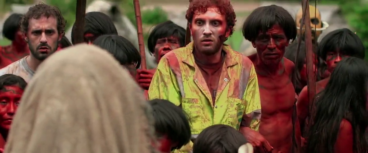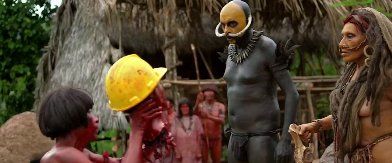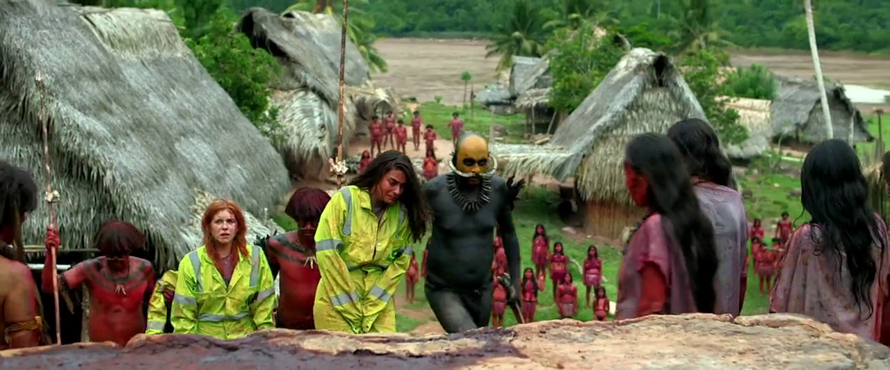 En su incesante espíritu reivindicador de cinematografías del horror pasadas, Eli Roth pretende con este The Green Inferno rendir culto al clásico Holocausto Caníbal (1980) de Ruggero Deodato, que a su vez sería en su tiempo el polémico film estrella del subgénero de indígenas antropófagos. En realidad, y dentro de ese ímpetu del cineasta que siempre antepone su cualidad de cinéfago a la de director, Roth invoca todo un homenaje y revisión al canibalismo italiano no sólo recordado por el film de Deodato, sino también impulsado por cineastas como el Umberto Lenzi de ¡Comidos Vivos! (1980) y Caníbal Feroz (1981), el Sergio Martino de La montaña del Dios caníbal (1978) o el Joe D´Amato de Emanuelle y los últimos caníbales (1977), entre otros. Como films de explotación se aprovechaban de frondosas localizaciones selváticas para mostrar de manera exacerbada los instintos carnívoros y primarios de grupos de indígenas, dentro de un horror de enorme calado gore que en algunos casos, como el propio Holocausto Caníbal, gozaban de un realismo natural aterrador y más concretamente en el film de Deodato con una mirada al horror directa gracias a sus formas narrativas que de paso inaugurarían en popularidad el llamado found footage. Influenciado y apadrinado por el subgénero mondo (con gran relevancia en los años 60 y que el film Este perro mundo a.k.a. Mondo Cane [1962]) popularizaría, ofrecía una interacción con la imagen auspiciada por su intrínseco carácter documental), y tan odiado como amado a partes iguales, el cine de caníbales se recuerda bajo la alta exposición de su violencia que aunque le sea achacable cierta gratuidad en su incidencia, se alimentaba de una lectura sobre el despertar del lado más salvaje del ser humano, quien recibiría una especie de justicia poética cuando los caníbales hiciesen despertar sus instintos más bajos.