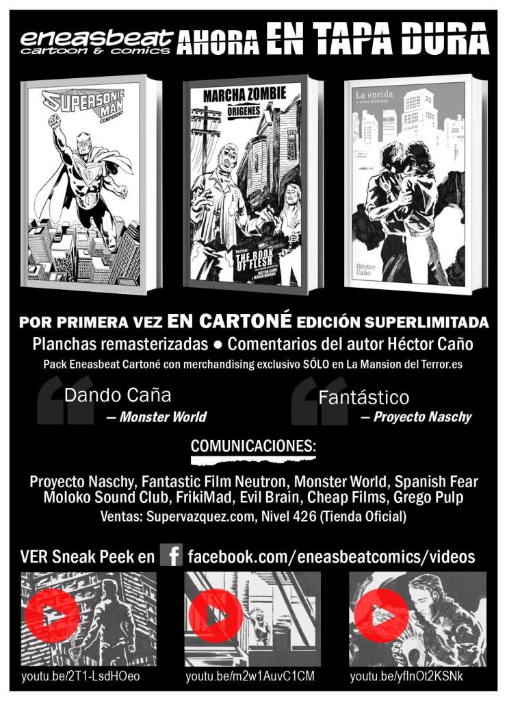 Bajo el sello editorial Eneasbeat cartoon & comics se encuentra el autor Héctor Caño, una de las figuras más interesantes del cómic nacional que presenta estos meses una serie de publicaciones que aglutinan algunos de sus más destacados trabajos. Dentro de sus más populares iniciativas encontramos la traslación a la viñeta de Supersonic Man, el superhéroe rescatado de la película de Juan Piquer Simón; una de sus entregas ya fue revisada en este Gabinete hace un tiempo, donde pudimos analizar algunas de sus virtudes . Caño, que además de su autoría en una faceta como el cómic ha destacado en la labor de autoedición desde la fundación de su propio sello, también ha escrito ensayos Del Objetivismo de Ayn Rand a los cómics de Steve Ditko y Stan Lee presenta… los cómics Marvel y la Historia. Repasemos en las siguientes líneas el paquete de novedades que Caño ha presentado recientemente: